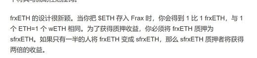 Frax: 22年底才发布,处于早期红利期,当前收益较高,ARP 上 sfrxETH 超 7%,Convex/Curve 做 LP 更是超过10% 。不过 frxETH 几乎没有折价,吃不到折价收窄的收益。frxETH具体设计逻辑可以参见下方 Thread。 frxETH 协议抽成为 10%,目前并未支付任何费用给节点运营商,疑似自运营,中心化程度略高于前两家。总体而言比较适合熟悉 Frax/Curve 生态的用户和较专业的 DeFi 用户。